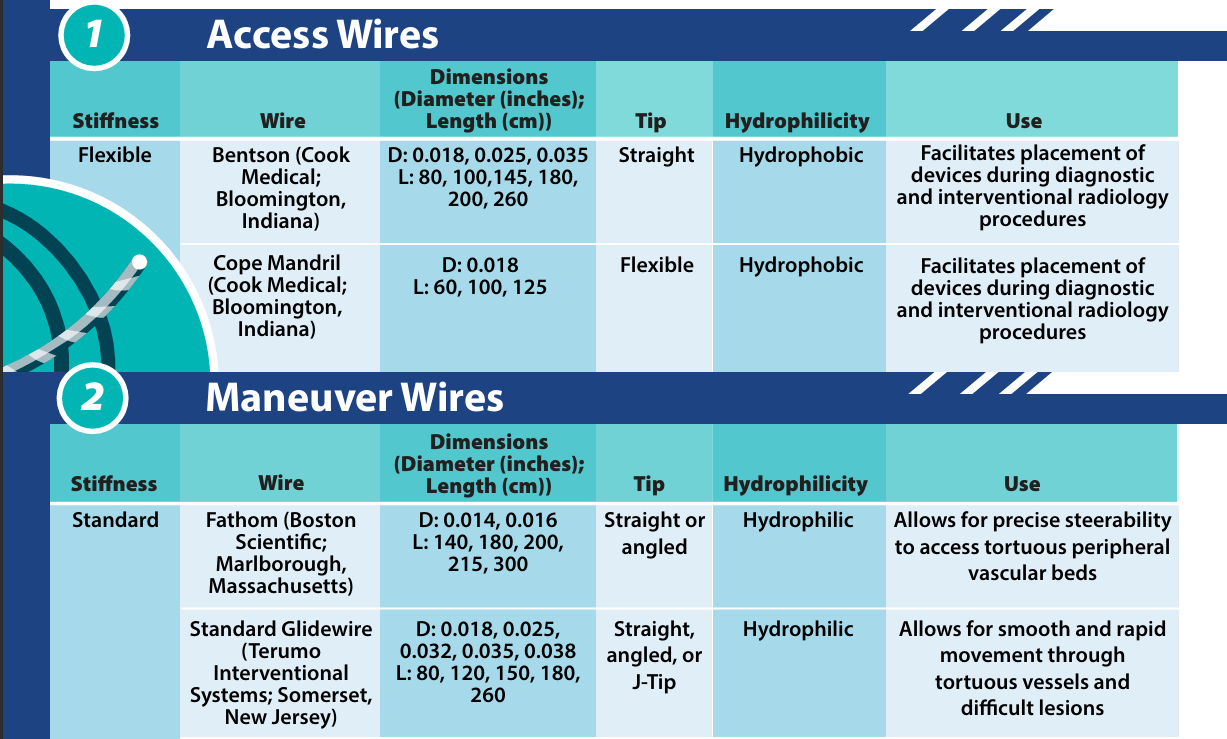 Knowledge of common wires used in interventional radiology is important as wires are integral to nearly all interventional radiology procedures. Wires vary in stiffness, dimensions, tip design and hydrophilicity and these properties dictate their use. Knowledge of these characteristics helps to predict the next steps in interventional radiology procedures and to plan equipment exchanges and catheter advancement.